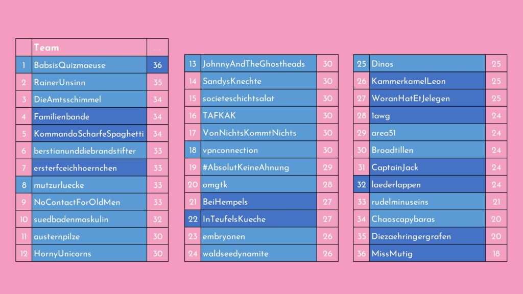 Das Gewinner-Team jedes Quizzes bekommt unendlich viel Ruhm und Ehre sowie die Gelegenheit, mir für das nächste Quiz ein Thema vorzugeben. Zu diesem Thema erstelle ich dann die acht Fragen der Themenrunde.